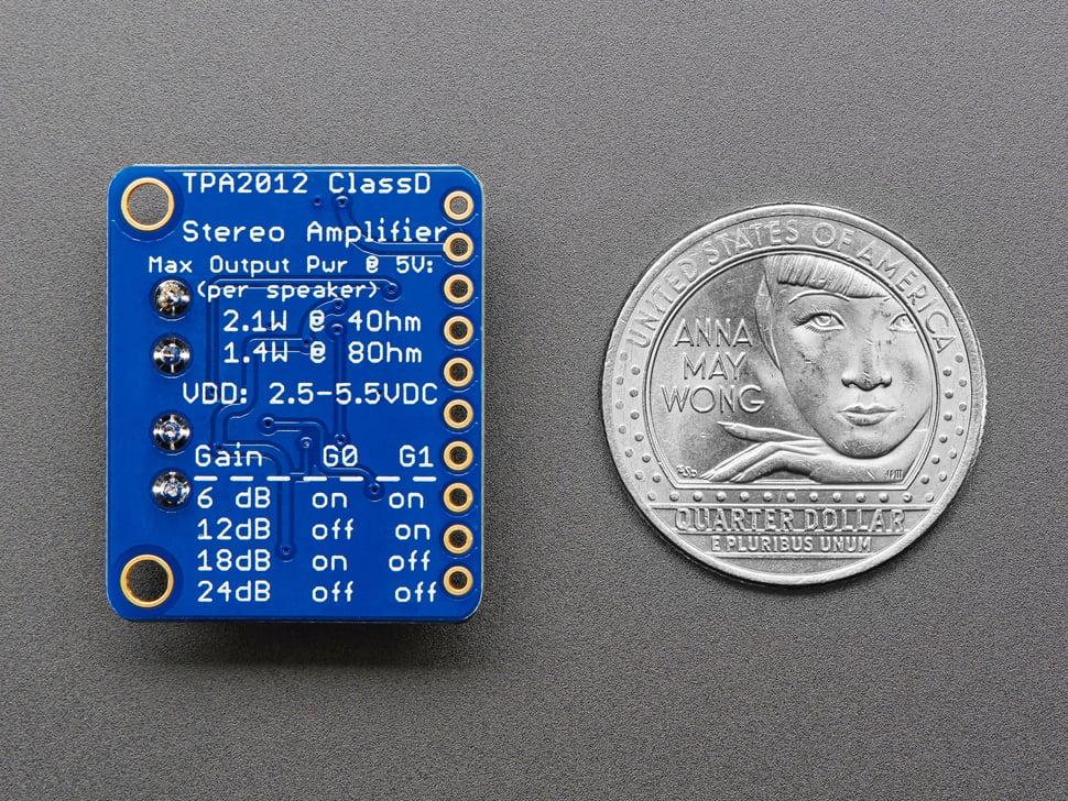 Dankzij de differentiële inputs via 1,0 uF condensatoren en de brug-gekoppelde outputs kan de versterker luidsprekers rechtstreeks aansturen en een blokgolf-PWM van ~300 kHz uitzenden die door de luidsprekerspoel wordt gemiddeld. Een volledig gemonteerd breakout board meegeleverd met een dubbele mini-DIP-switch voor het aanpassen van de versterking en 3,5 mm terminal blocks voor eenvoudige aansluiting van luidsprekers.