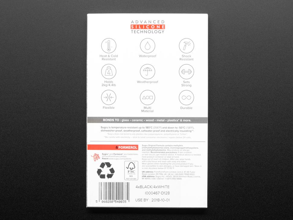 Sugru hardt uit bij kamertemperatuur en vormt 's nachts sterke, flexibele siliconen. Het is bestand tegen temperaturen van -60 °C tot 180 °C, waardoor het ideaal is voor uiteenlopende omgevingen. Sugru is uv-bestendig en vaatwasserbestendig. De aanpasbaarheid van Sugru wordt gecompleteerd door de mengbare kleuren, wat de creativiteit stimuleert. Elk zakje bevat zwarte en witte miniverpakkingen van 5 g, zodat u altijd voldoende voorraad hebt.