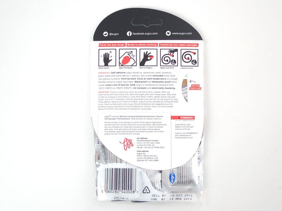 Deze unieke siliconen harden uit bij kamertemperatuur tot een robuuste, flexibele afwerking die zowel waterbestendig als vaatwasmachinebestendig is. Sugru is bestand tegen temperaturen van -60 °C tot 180 °C en blijft betrouwbaar onder verschillende omstandigheden, waaronder blootstelling aan uv-straling.