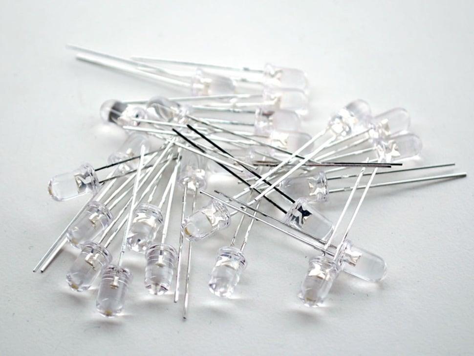 Elke verpakking bevat 25 helderwitte leds met een diameter van 5 mm, die een koelwitte kleur uitstralen. Ze werken op een typische doorlaatspanning van 3,0 V bij een stroomsterkte van 20 mA. Verwacht een minimale helderheid van 15.000 mcd, met een kijkhoek van ±12 graden. De maximale continue stroomsterkte is 20 mA. Raadpleeg onze tutorial "Inleiding tot het gebruik van leds" voor meer informatie over het gebruik van leds in uw elektronicaproject.