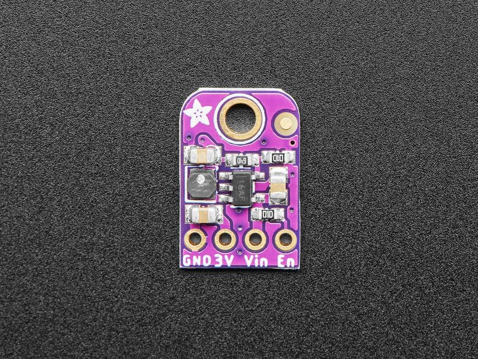 De Adafruit TLV62569 3,3V breakout werkt op een precieze vaste frequentie van 1,5 MHz en ondersteunt korte stroompieken tot 2 A. Als een bredere ingangscompatibiliteit vereist is, overweeg dan de 3,3V MPM3610 breakout , die inputs tot 20 V ondersteunt. Dit product wordt geleverd met een volledig geassembleerde en geteste board , plus headers voor eenvoudige integratie breadboard .