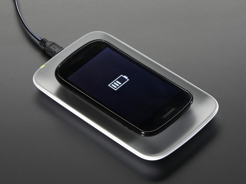 Houd er rekening mee dat sommige apparaten, zoals de Moto X, mogelijk extra spanning op de datakabels nodig hebben en niet met alleen deze ontvanger kunnen worden opgeladen. Raadpleeg de online documentatie van uw telefoon voor de specifieke vereisten. Koppel de ontvanger aan een Qi-zender, verkrijgbaar in de Adafruit -winkel, om uw draadloze oplaadconfiguratie te voltooien.