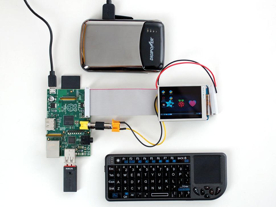 Hij beschikt over een lithium-polymeerbatterij van 3300 mAh, een laadcircuit en dubbele boost-converters met 1 Ampère en 500 mA outputs via USB -poorten. Perfect voor de Pi: de 1 Ampère output zorgt voor een soepele werking, zelfs met aangesloten accessoires. We hebben hem uitgerust met een 2,5-inch NTSC- display , een draadloos toetsenbord/muis en een wifi-dongle, waardoor een compact computerstation zonder haperingen is ontstaan.