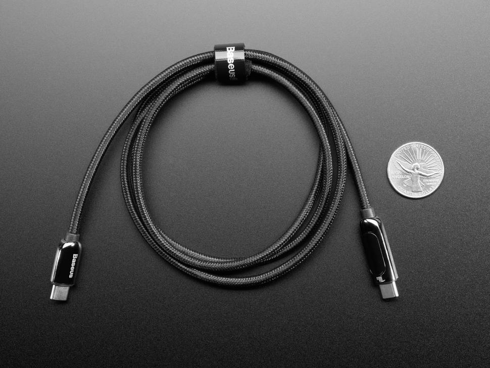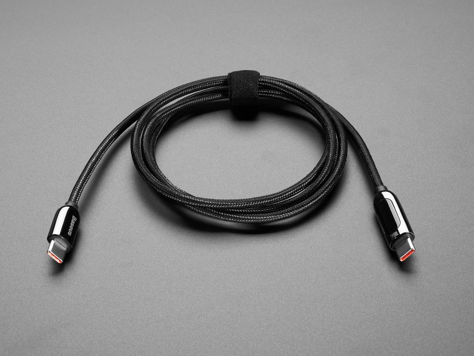 Deze zwarte gevlochten USB C naar USB C-kabel met een 100W watt-weergave maakt het makkelijk om je opladerinstellingen te bepalen: kijk gewoon aan het uiteinde van de USB C-plug om te zien hoeveel stroom er naar je telefoon of laptop gaat. ~3W is een standaard 5V / 500mA verbruik, maar met de juiste USB Type C PD-stroomadapters kun je tot 20V 5A krijgen voor een flitsende 100 Watt!