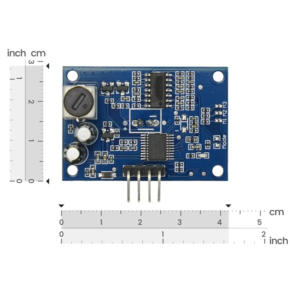 De sensor is uitgerust met verschillende bedrijfsmodi voor eenvoudige integratie en aanpasbaarheid. In de PWM-pulsbreedte- output initieert een hoge puls de meting, ideaal voor directe microcontrollerverbindingen. De automatische UART- output beheert metingen elke 100 ms en streamt gegevens via UART, wat de implementatie vereenvoudigt. De UART-gestuurde output maakt nauwkeurige controle van de meettiming mogelijk via UART-commando's. Tot slot verandert de output de sensor in een naderingsschakelaar, waarbij de output wordt geactiveerd bij het detecteren van objecten binnen een ingestelde afstand.
