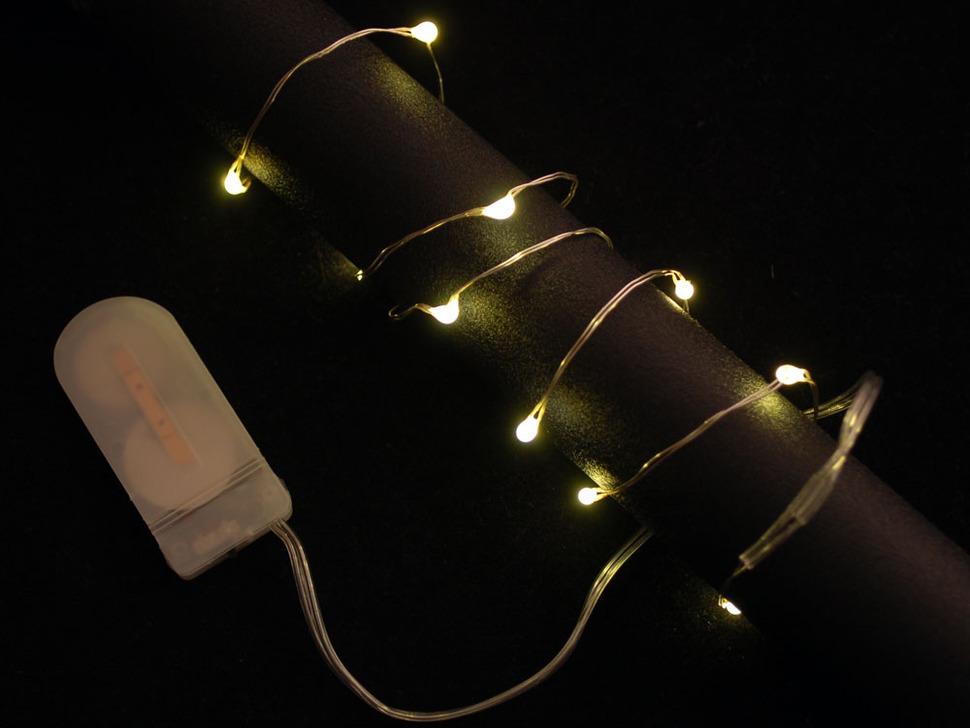 De strengen zijn waterdicht voor gebruik buitenshuis, maar zorg ervoor dat de batterijhouder beschermd is. Elke streng van 90 cm lang bestaat uit 10 leds, met een onderlinge afstand van ongeveer 10 cm. Aan het ene uiteinde is een stranded draad met een kern gesoldeerd en gekrompen voor duurzaamheid, terwijl het andere uiteinde is aangesloten op een houder voor 2 CR2032 knoopcelbatterijen met een aan/uit-schakelaar.