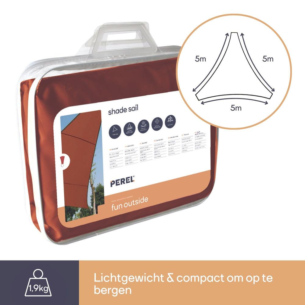 Verander je buitenruimte met het Zonnezeil Driehoek, met een afmeting van 5 x 5 x 5 meter in een levendige terracotta kleur. Dit zeil is ontworpen om optimale schaduw te bieden, waardoor de blootstelling aan UV-stralen vermindert en de uitstraling van je ruimte wordt verbeterd.